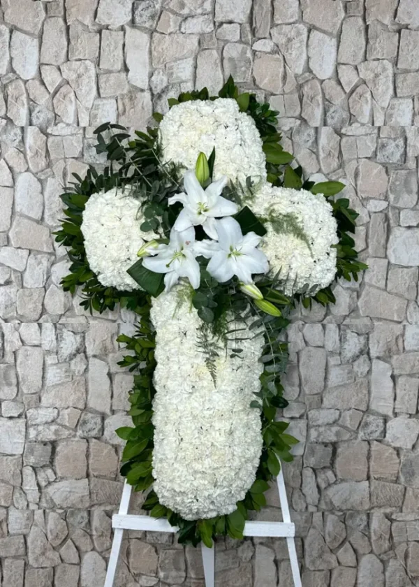 Nuestra cuidada Cruz de flores Ojén es una pieza confeccionada con lilium blanco con un toque de verdes ornamentales.